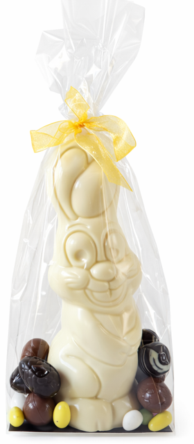 De paashaas kan zowel in het puur, melk of wit. Verder is het pakket aangevuld met kleurrijke suikereitjes en 100g gevulde paaseitjes.Bevat Lactose, noten (hazelnoten)